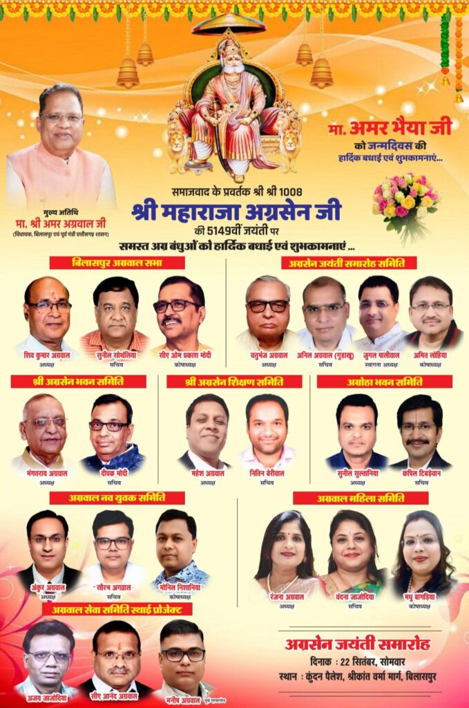 बिलासपुर, अगस्त, 31/2025 महाराजा अग्रसेन जयंती की तैयारियों का आगाज़.. “आवरण – कल से कल तक” कार्यक्रम से जल व पर्यावरण संरक्षण का संदेश… बिलासपुर। श्री श्री 1008 महाराजा अग्रसेन…