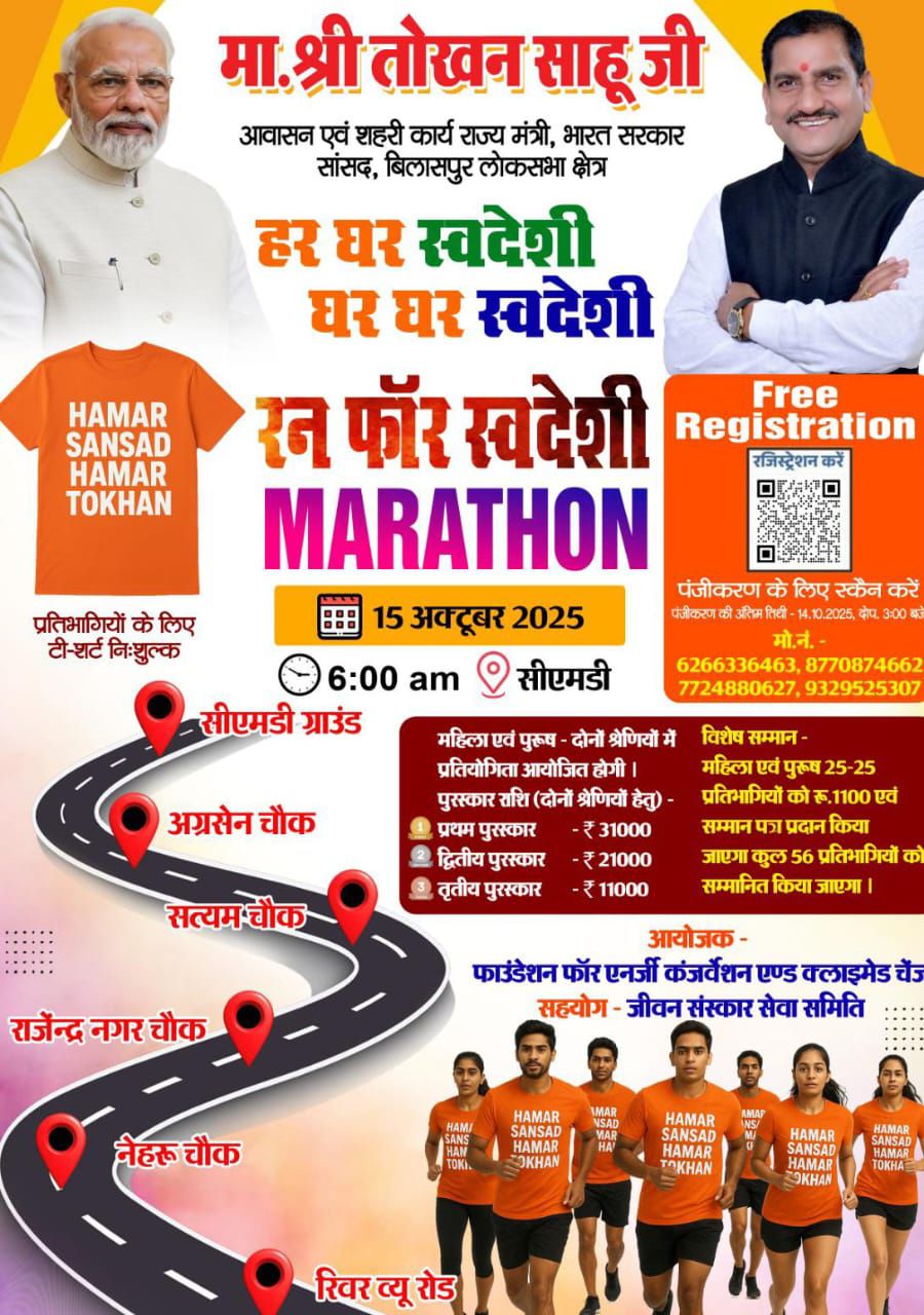 स्वदेशी और आत्मनिर्भर भारत के संदेश के साथ ‘रन फॉर स्वदेशी’ मैराथन का आयोजन — केंद्रीय मंत्री तोखन साहू के जन्मदिन पर प्रेरक आयोजन…